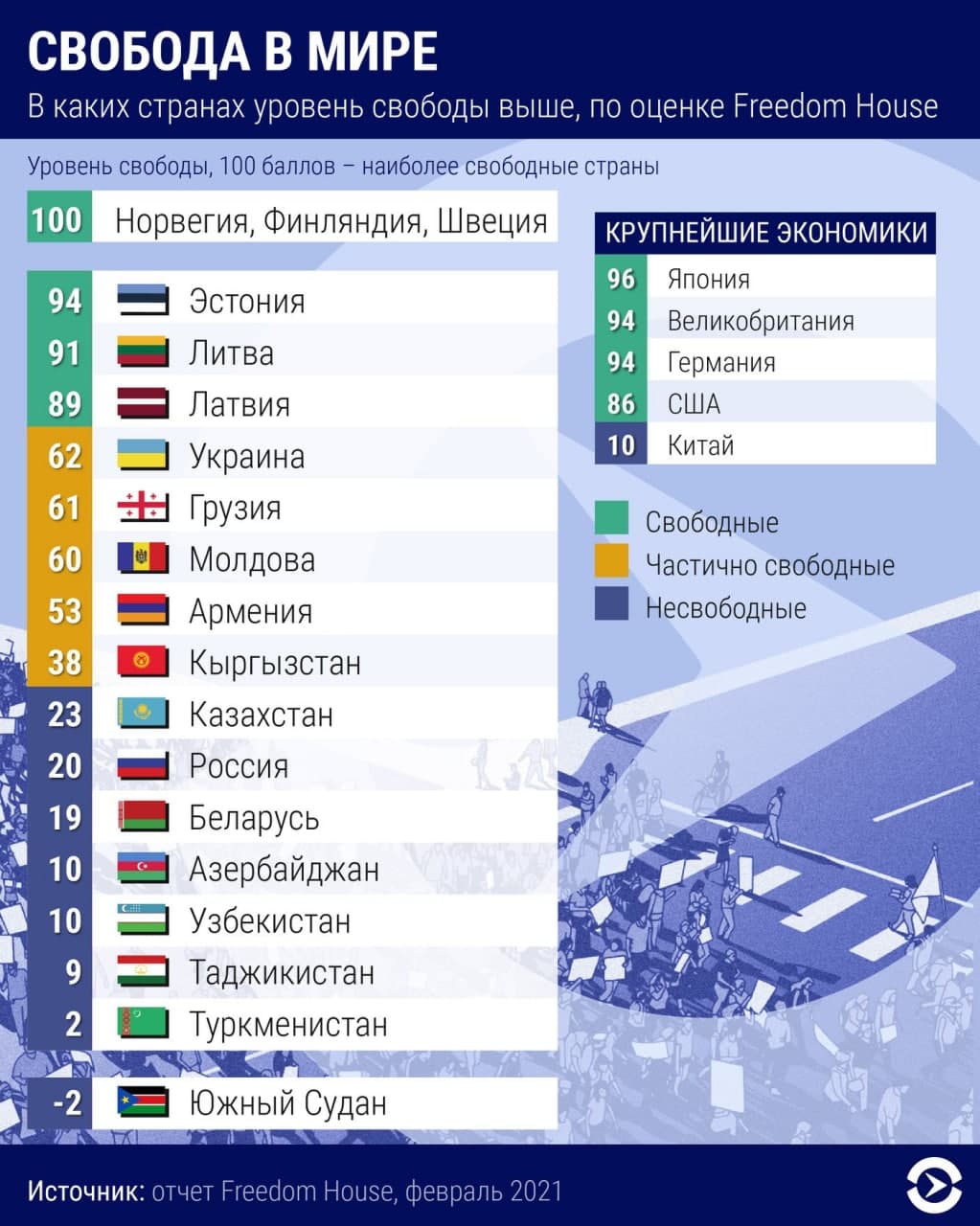 Среди постсоветских стран Украина оказалась между Латвией, у которой 89 баллов, и Грузией, у которой 61. Лучше всего со свободой, среди стран соцлагеря, у Эстонии (91), хуже всего у Туркменистана, который набрал лишь 2 балла и занимает предпоследнюю позицию мирового рейтинга, опережая только Южный Судан, который набрал -2.