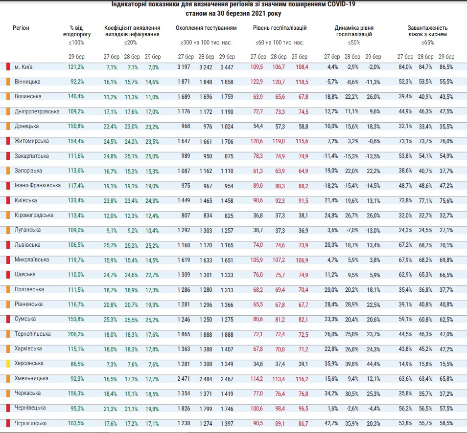Так, при определенном показателе уровня госпитализаций в 60 на 100 тыс. населения, в Киеве этот показатель, по состоянию на 28 марта, составил 108,4. Самый высокий показатель госпитализаций в Винницкой области - 118,5 на 100 тыс. населения, в Житомирской области - 115,6, в Хмельницкой области - 116,2.