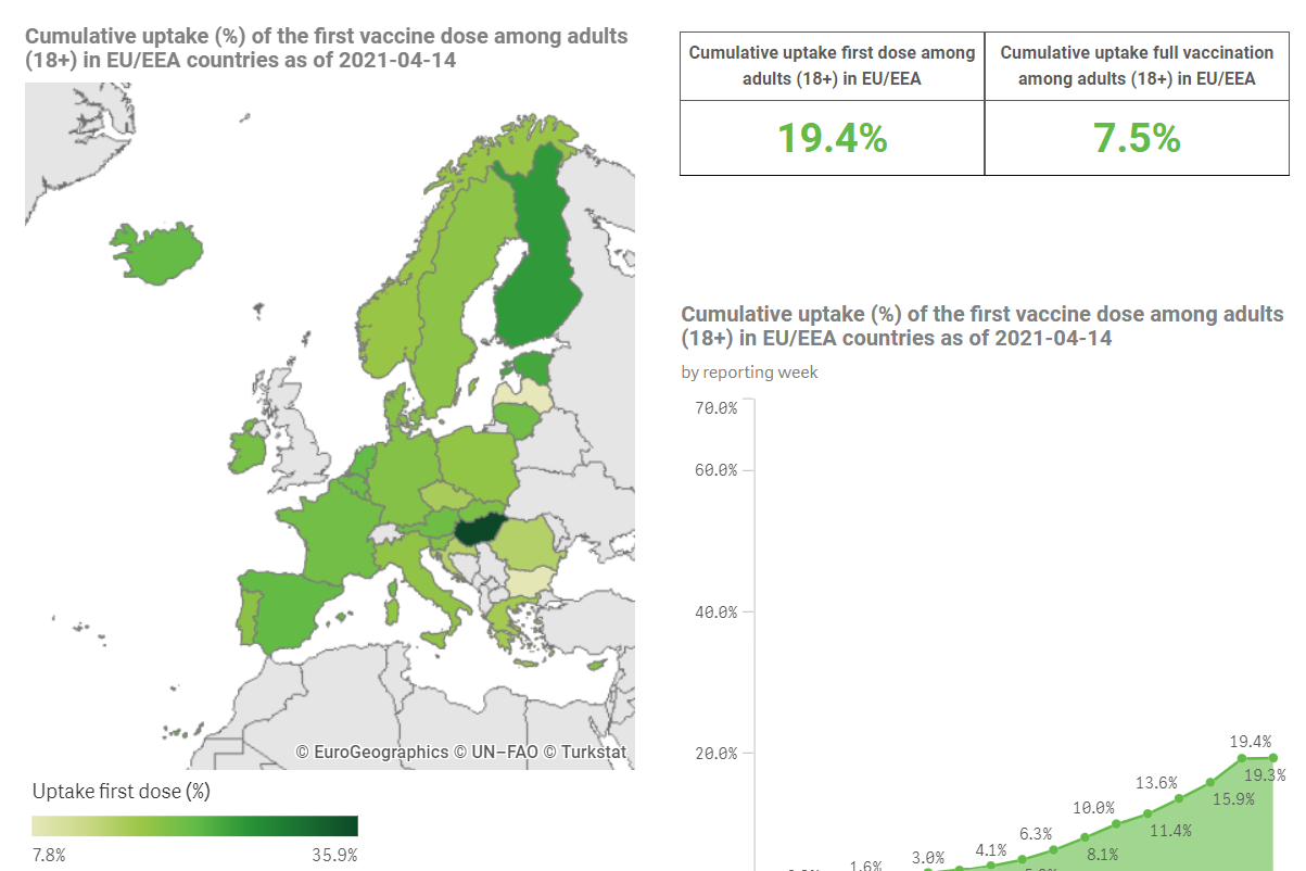 По данным Европейского центра контроля и предупреждения заболеваний, прививки первой дозой получили уже 19,4% взрослого населения стран ЕС и Европейской экономической зоны, и 7,5% - обеими дозами.