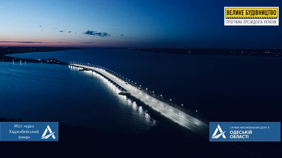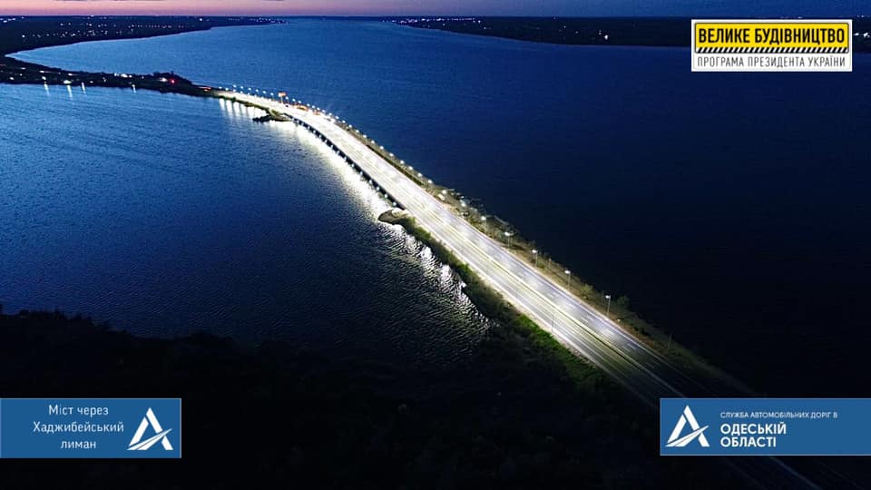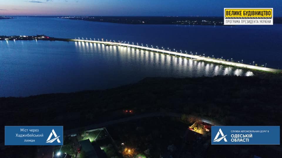 Открытый в конце апреля после реконструкции в рамках программы "Большая стройка" мост через Хаджибейский лиман под Одессой, освещается с помощью 68 опор, установленных на обеих сторонах моста.
