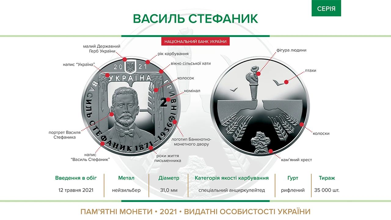 На аверсе монеты размещены малый герб Украины, портрет Стефаника, «вписанный» в окно сельской хаты, имя писателя и годы жизни (1871–1936), а также логотип Банкнотно-монетного двора.