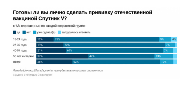 Вакцинироваться российским препаратом оказались готовы только 26% опрошенных, 10% уже привились Sputnik V, еще около 2% – против любых вакцин в целом.