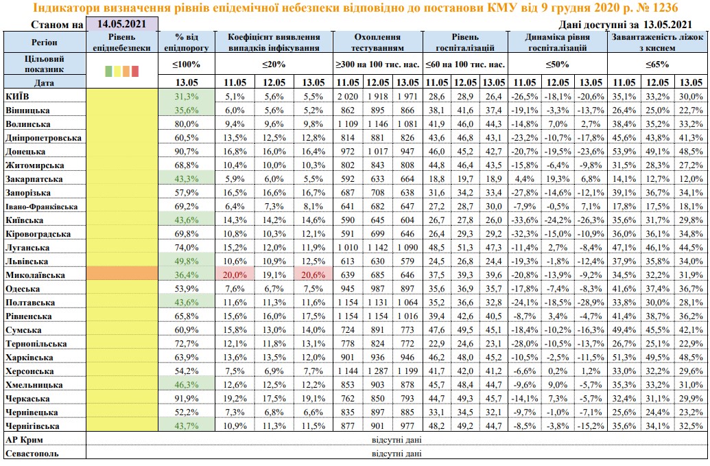 В то же время девять регионов уже соответствуют "зеленой" зоне по проценту от эпидемического порога: Киев, Волынская, Закарпатская, Киевская, Львовская, Николаевская, Полтавская, Хмельницкая и Черниговская область.