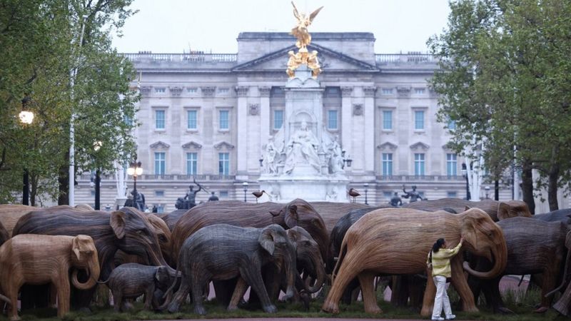 На рассвете в субботу перед Букингемским дворцом в Лондоне появились 125 деревянных слонов. Акция призвана продемонстрировать возможность мирного сосуществования людей и животных в современном мире.