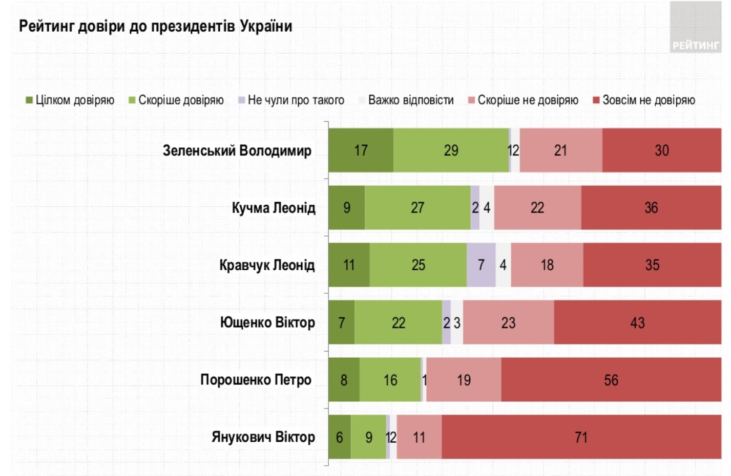 Среди политиков, которые занимали должность Президента Украины, самый высокий рейтинг доверия у действующего Главы государства В.Зеленского (доверяют - 46%, не доверяют - 51%). Л.Кучме доверяют 36%, не доверяют - 58%. Л.Кравчуку доверяют 36%, не доверяют - 53%. В.Ющенко доверяют 29%, не доверяют - 66%. П.Порошенку доверяют - 24%, не доверяют - 75%. В.Януковичу доверяют 15%, не доверяют - 82%. По сравнению баланса доверия / недоверия на втором году президентства ситуация у В.Зеленского заметно отличается в лучшую сторону, чем у двух его предшественников П.Порошенка и В.Януковича.