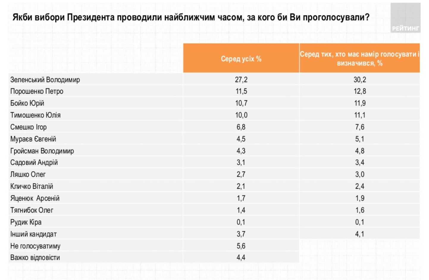 Если бы в ближайшее время состоялись выборы Президента, то 30,2% проголосовали бы за В.Зеленского (среди тех, кто будет голосовать и определился с выбором). 12,8% поддержали бы П.Порошенка, 11,9% - Ю.Бойка, 11,1% - Ю.Тимошенко, 7,6% - И.Смешка, 5,1% - Е.Мураева. Поддержка других кандидатов ниже 5%.