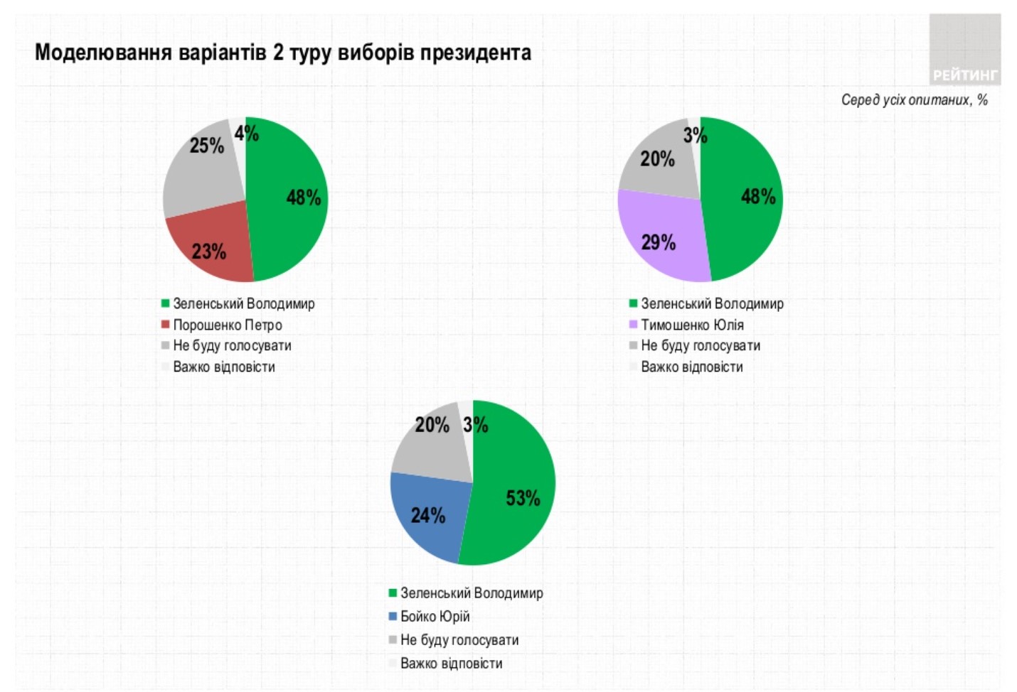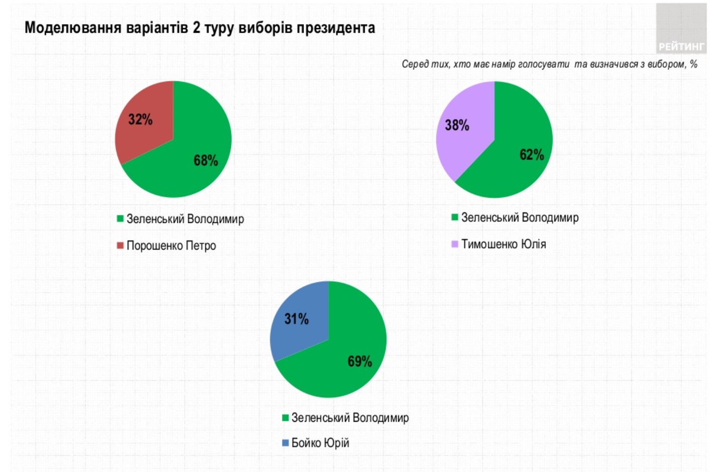 Если бы во второй тур сегодня вышли В.Зеленский и П.Порошенко, то 68% среди избирателей поддержали бы действующего Президента, а 32% - проголосовали за Порошенка. В случае выхода во второй тур В.Зеленского и Ю.Тимошенко - 62% в пользу действующего Президента, 38% - за лидера партии «Батькивщина». В случае выхода во второй тур Ю.Бойко с Главой государства, у В.Зеленского - 69%, лидера партии «Оппозиционная платформа - За життя» - 31%.