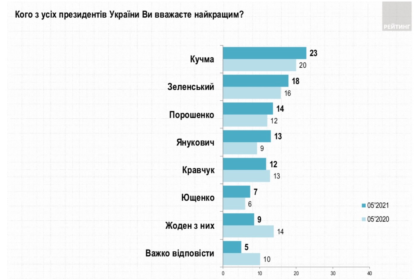 Среди всех президентов независимой Украины, как и в прошлом году, лучшим считают Л.Кучму (23%). 18% ответили, что лучшим президентом является В.Зеленский, 14% считают, что лучшим был П.Порошенко, 13% считают, что лучшим был В.Янкукович, 12% - Кравчук и лишь 7% - В.Ющенко. В то же время, 9% ответили, что ни один из них не был лучшим, еще 5% - затруднились ответить.