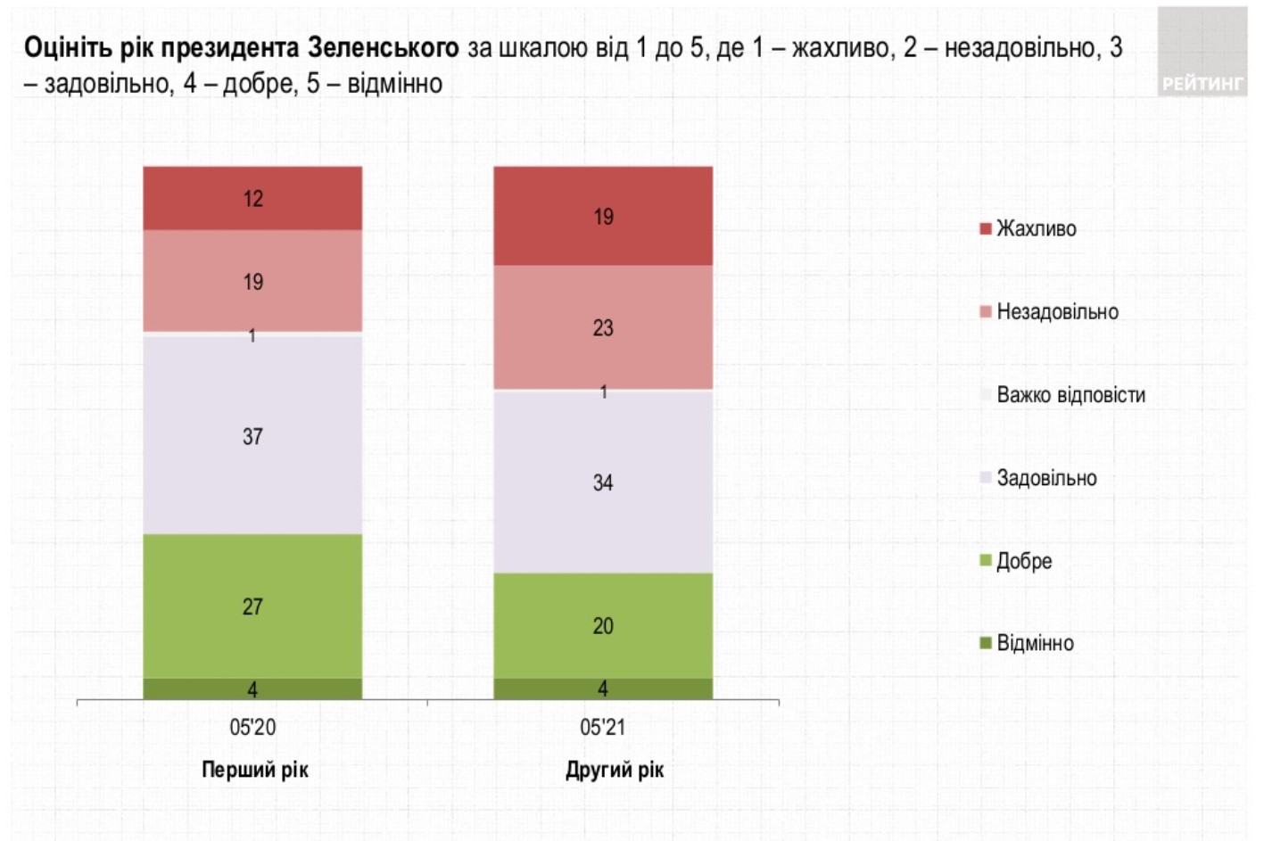 Четверть опрошенных оценивают второй год правления Президента Зеленского на отлично или хорошо, 34% - удовлетворительно, 42% - неудовлетворительно или ужасно. Относительно лучше оценивают второй год каденции действующего Главы государства жители Запада и Центра, молодежь, избиратели В.Зеленского.