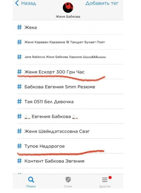 Отмечается, что в Getcontact Бабкова подписана как "Женя эскорт", "Танцует, бухает, поет", "Тупое недорогое" и т.д.
