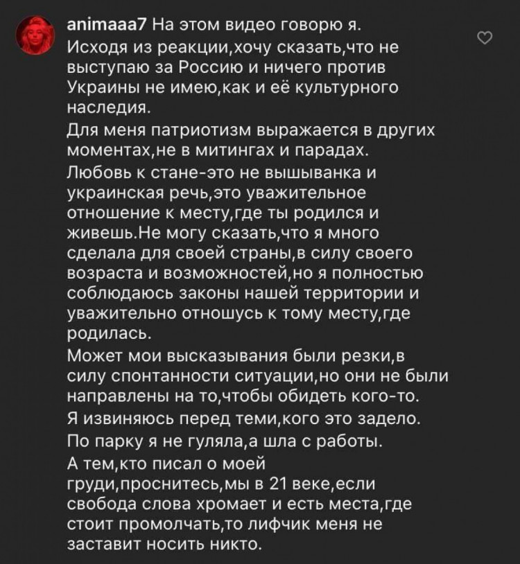 Этот ролик быстро разлетелся харьковскими телеграм-пабликами, и вызвал бурю эмоций у жителей города. В то же время она попыталась оправдаться в комментариях в Instagram, а позже полностью удалила свой аккаунт.