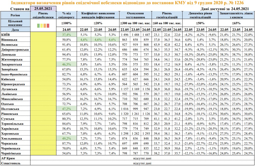 Теперь в Донецкой области процент от эпидемического порога составляет 94,4% при норме 100%. При этом в пяти регионах показатели частично соответствуют "зеленой" зоне карантина. В Киеве, Закарпатской, Полтавской и Хмельницкой областях ниже процент от эпидпорога составляет менее 50%, а в Винницкой области - коэффициент выявления случаев инфицирования менее 5%.