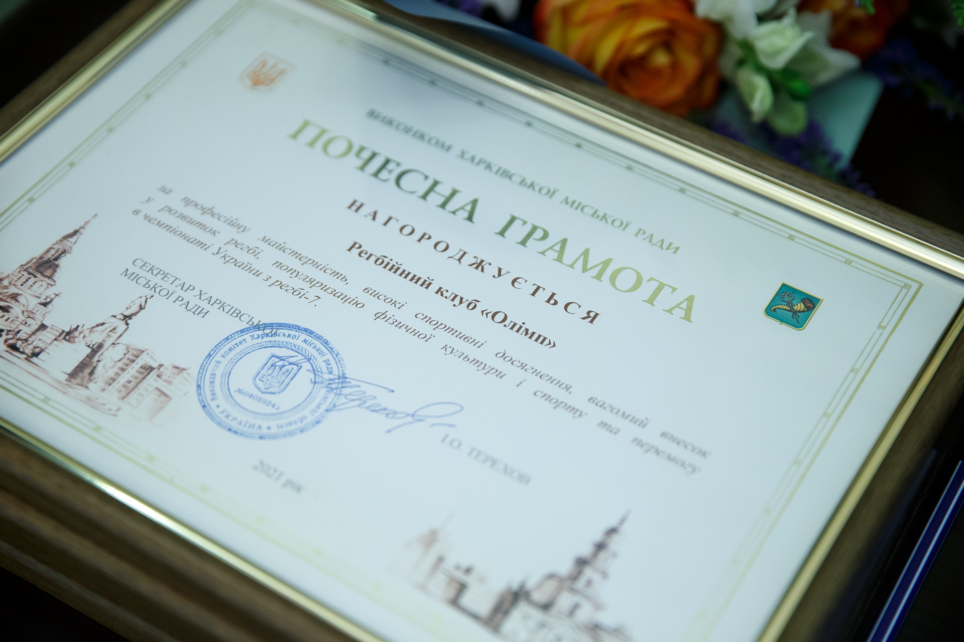 Игроки и тренеры клуба "Олимп" получили почетные грамоты и благодарности. В ответ регбисты презентовали вице-мэру Харькова Игорю Терехову фирменный клубный подарок - футболку со своими автографами.