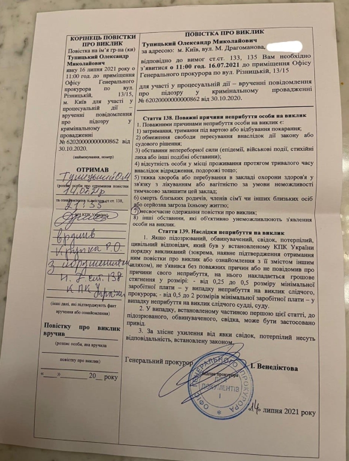 Согласно тексту вызова, Тупицкому нужно явиться в Офис генпрокурора в пятницу, 16 июля, в 11:00.