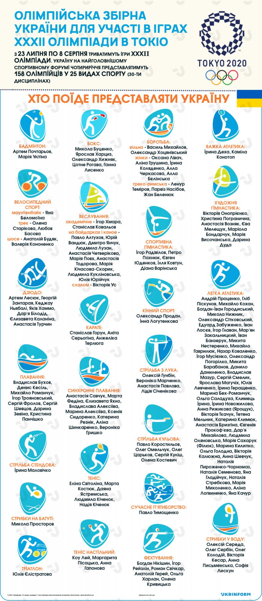 На главном спортивном форуме четырехлетия - ХХХІІ Олимпийских играх, которые пройдут в японском Токио с 23 июля по 8 августа, - Украину будут представлять 158 олимпийцев в 25 видах спорта (30-ти дисциплинах).