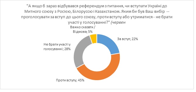 Что касается вступления Украины в Таможенный Союз, в большинстве своем жители Украины выступают против: если бы референдум по вопросу, вступать ли Украине в Таможенный Cоюз проводился в июне 2021 года, за вступление Украины в Таможенный Cоюз проголосовали бы 22% жителей Украины, против - 45%.