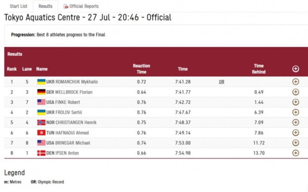 Романчук показал лучший результат в заплыве на дистанции 800 метров вольным стилем и установил новый олимпийский рекорд – 7.41.28. Мировой рекорд остается у китайского пловца Чжан Линя (установлен в Риме в 2009 году).