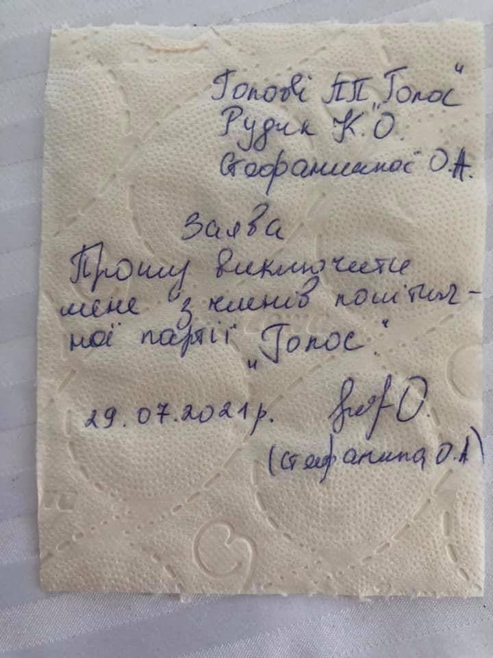 В связи с этим одна из депутатов "Голоса" Ольга Стефанишина написала заявление об исключении ее из членов партии. Причем сделала это на куске туалетной бумаги.