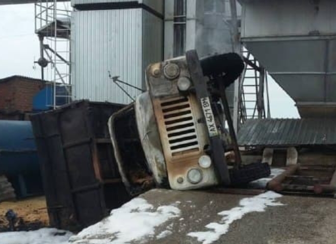 "Во время выгрузки зерна произошел переворот грузового автомобиля с зерном на бок, в результате чего произошло повреждение газового оборудования с последующим возгоранием", - говорится в сообщении ГСЧС.