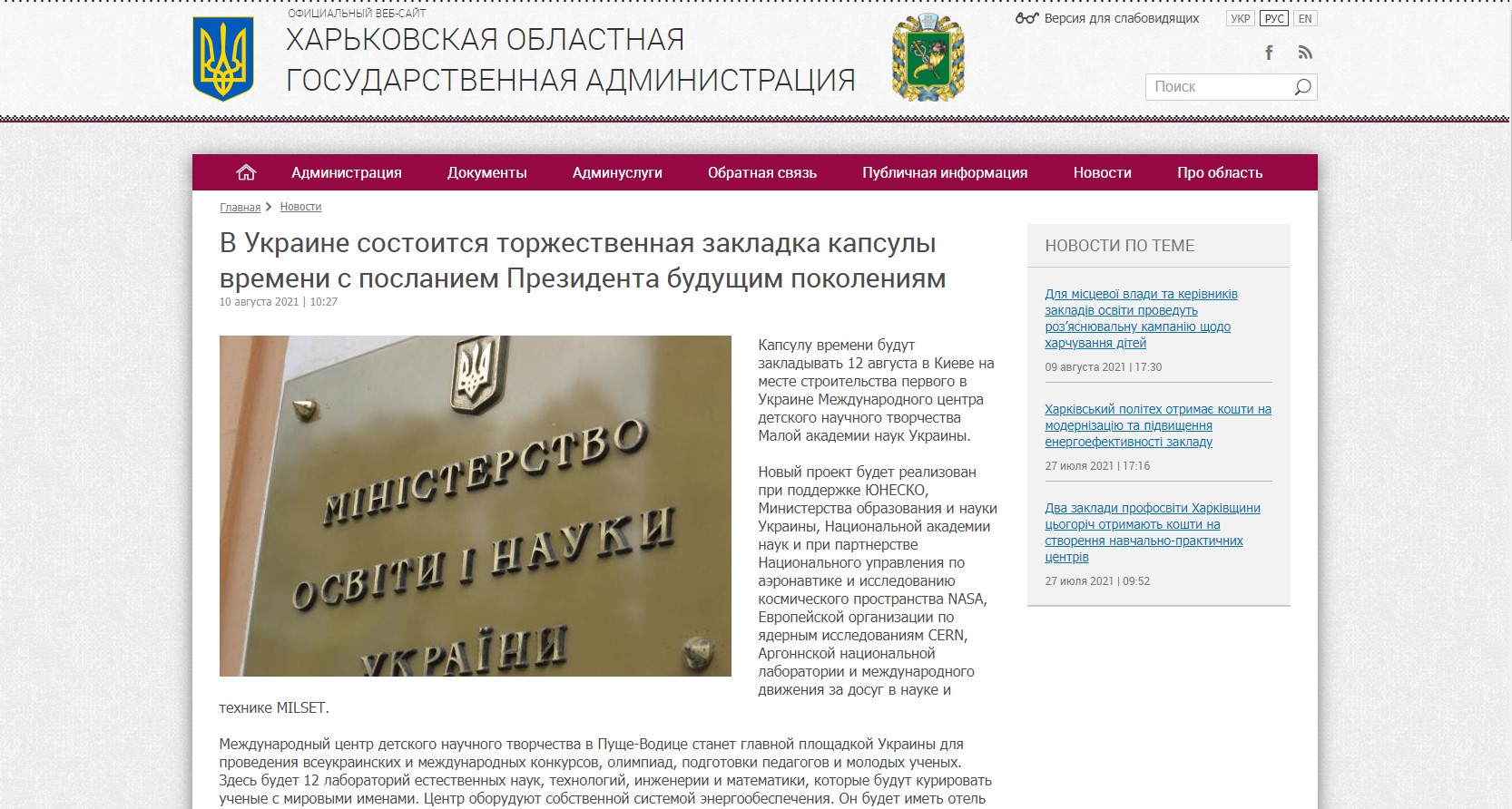 В Украине состоится торжественная закладка капсулы времени с посланием Президента будущим поколениям, сообщает пресс-служба Харьковской областной государственной администрации.