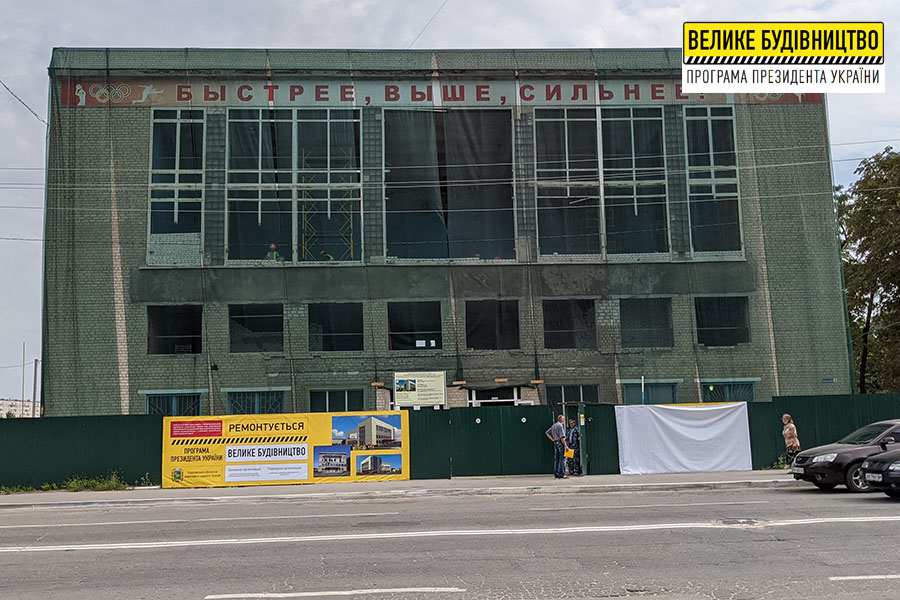 Сейчас на спортивном объекте проведен демонтаж старого перекрытия и окон, а также проводится перепланировка помещений и усиление конструкций здания.