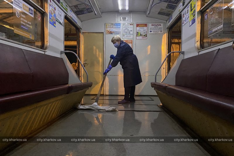 КП «Харьковский метрополитен» выполняет весь комплекс уборки подвижного состава, включая влажную уборку с применением моющих и дезинфицирующих средств.