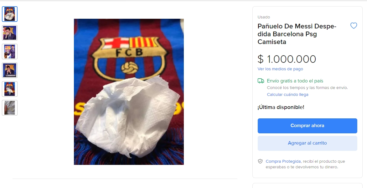 Платок бывшего форварда "Барселоны" Лионеля Месси, которым он вытирал слезы на прощальной пресс-конференции, выставили на аукцион Mercadolibre.