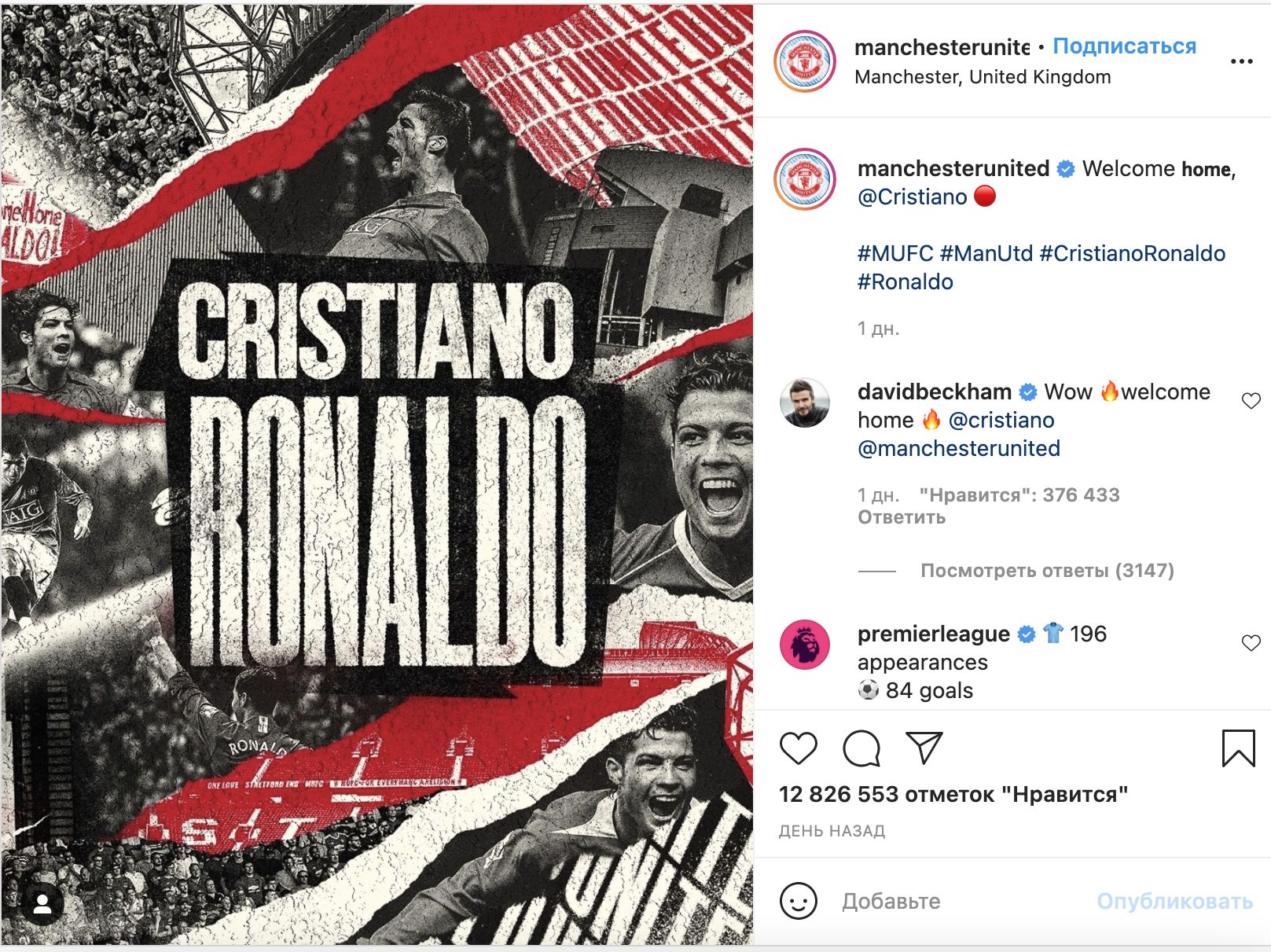 «Манчестер Юнайтед» в Instagram побил рекорд по количеству лайков среди аккаунтов спортивных клубов. Рекордным стал пост английской команды о возвращении португальского нападающего Криштиану Роналду. К этому моменту публикация набрала более 12 826 553 лайка.