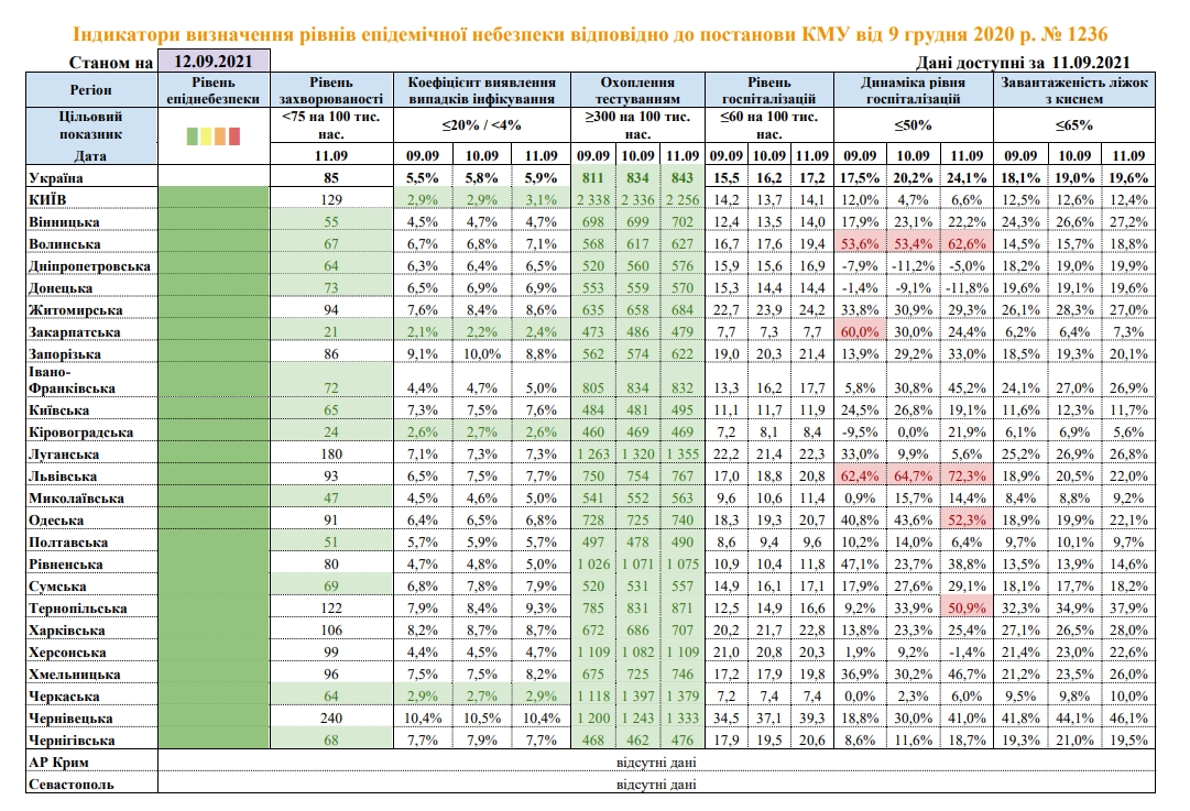 В Волынской, Львовской, Одесской и Тернопольской областях динамика уровня госпитализаций 11 сентября превысила предельный показатель, установленный для "зеленой" зоны эпидемиологической опасности, в двух из них такая тенденция сохраняется три дня подряд.