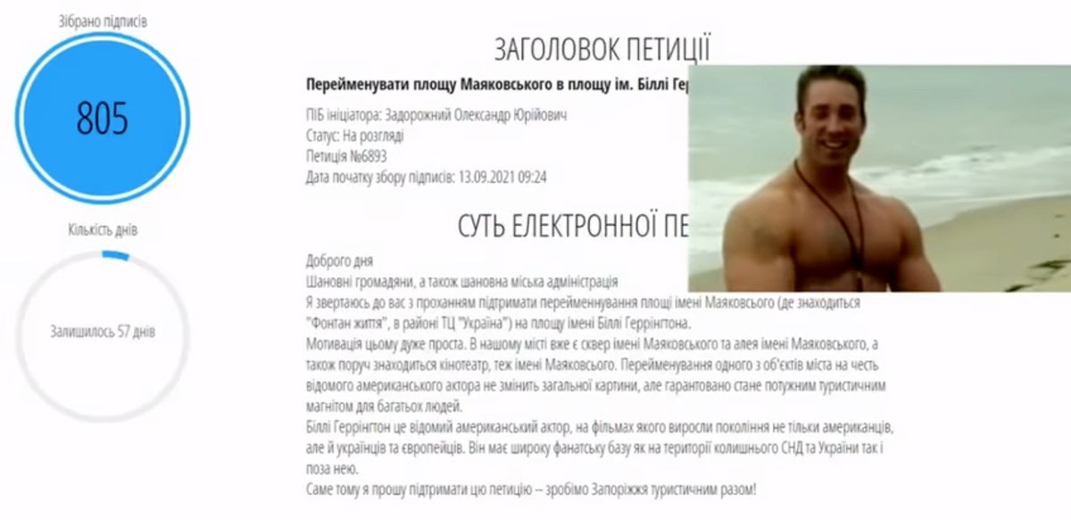 В Запорожье площадь Маяковского просят переименовать в честь ныне покойного порноактера Билли Херрингтона. Соответствующая петиция появилась на сайте горсовета.