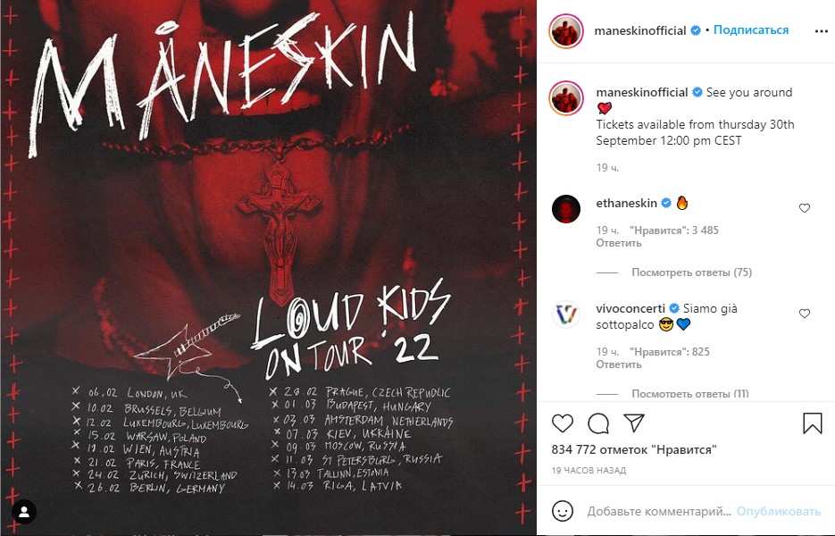Турне Måneskin включает 16 выступлений. Начнется он концертом в Лондоне 6 февраля. Далее победители "Евровидения-2021" выступят в Брюсселе, Люксембурге, Варшаве, Вене, Париже, Цюрихе, Берлине и Праге.