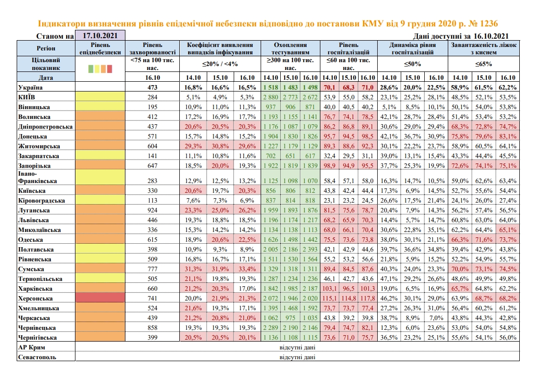 В частности, три дня подряд превышен уровень в 60 госпитализаций на 100 тыс. населения в 15 регионах, коэффициент выявления случаев COVID-19 – в шести областях. Оба показателя три дня подряд превышены в Днепропетровской, Житомирской, Луганской, Сумской и Черниговской областях.