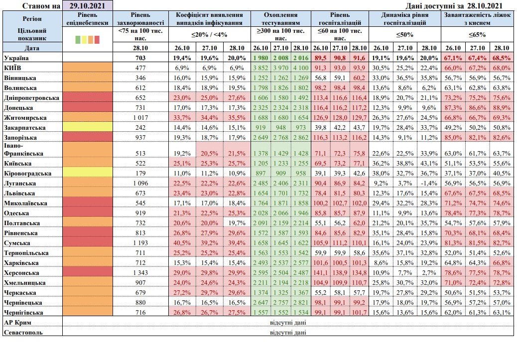 По состоянию на утро 29 октября в Украине лишь Закарпатская и Кировоградская области соответствуют "желтому" уровню эпидемиологической опасности.