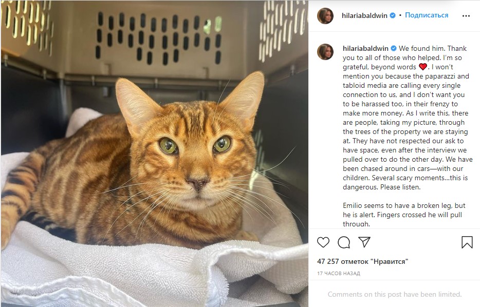 В своей публикации Хилария Болдуин поблагодарила тех, кто принял участие в поисках пропавшего у семьи кота. Однако она предпочла не называть имена людей, которые нашли животное, чтобы не подвергать их преследованиям журналистов «в их безумном стремлении заработать больше денег». «Пока я пишу это, меня фотографируют через деревья дома, где мы остановились», — написала супруга актера.