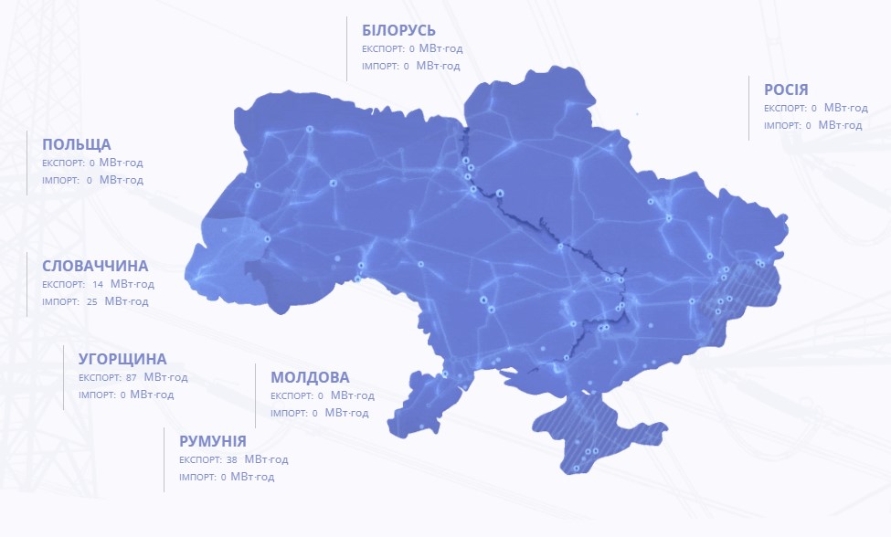 Импорт электроэнергии из Беларуси составляет 0 МВт-час. Однако еще вчера мощность составляла 415 МВт-час.