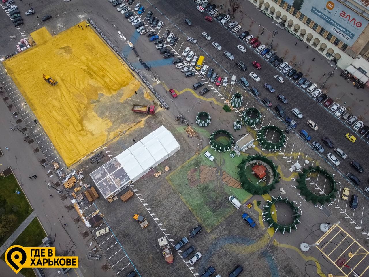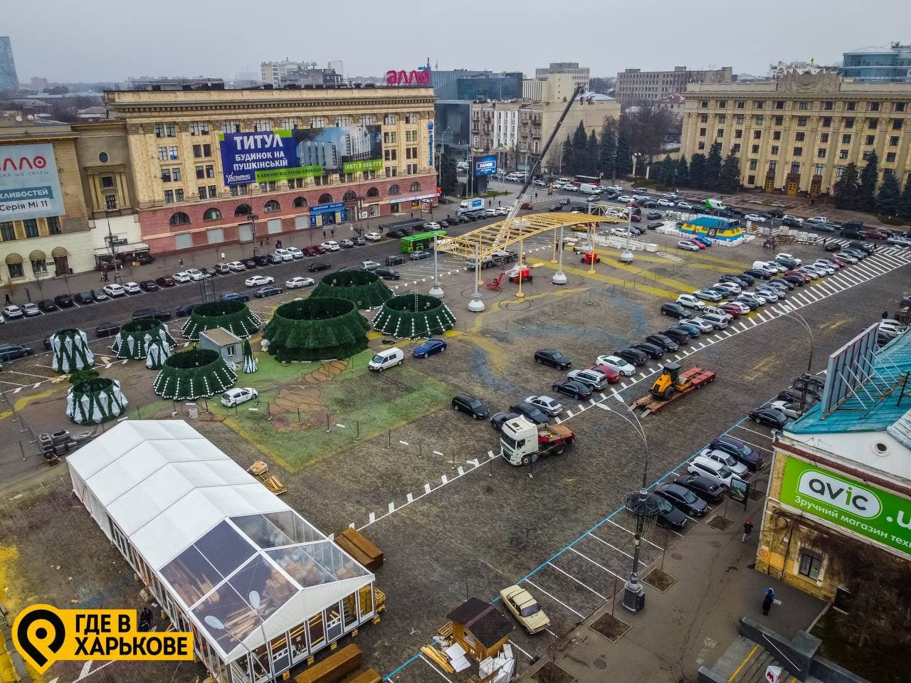 На площади Свободы активно готовятся к празднованию новогодних праздников. На опубликованных телеграм-каналом "Где в Харькове" фото, видно как обустраивают ледовый каток, монтируют "звездное небо" и главный символ праздника Новогоднюю елку.