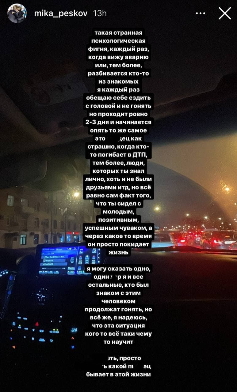 «Такая странная психологическая фигня: каждый раз, когда вижу аварию или тем более разбивается кто-то из знакомых, я каждый раз обещаю себе ездить с головой и не гонять, но проходит 2-3 дня, и начинается то же самое», — написал 17-летний Мика Песков.