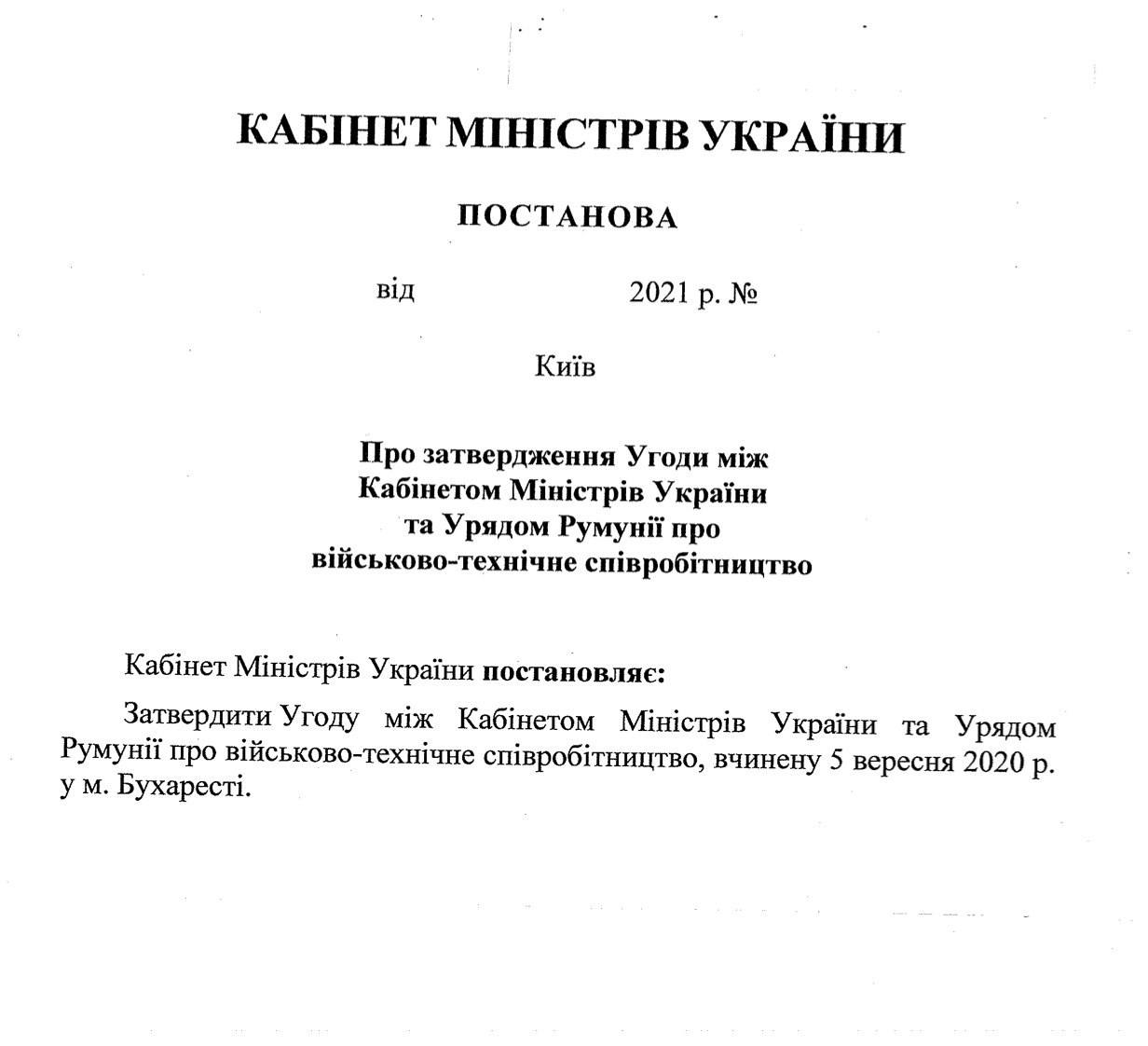 Кабинет министров Украины утвердил соглашение с правительством Румынии о военно-техническом сотрудничестве, предусматривающее закупку у этой страны - участницы НАТО - вооружений, боеприпасов и военной техники в рамках совместных проектов. Соответствующее постановление украинского правительства принято на заседании в среду, 24 ноября.