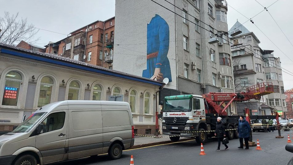 По ее словам, разрешение на нанесение на стену рисунка и автовышку художникам предоставил городской Департамент жилищно-коммунального хозяйства. Над концепцией стенописи художники работали с лета.