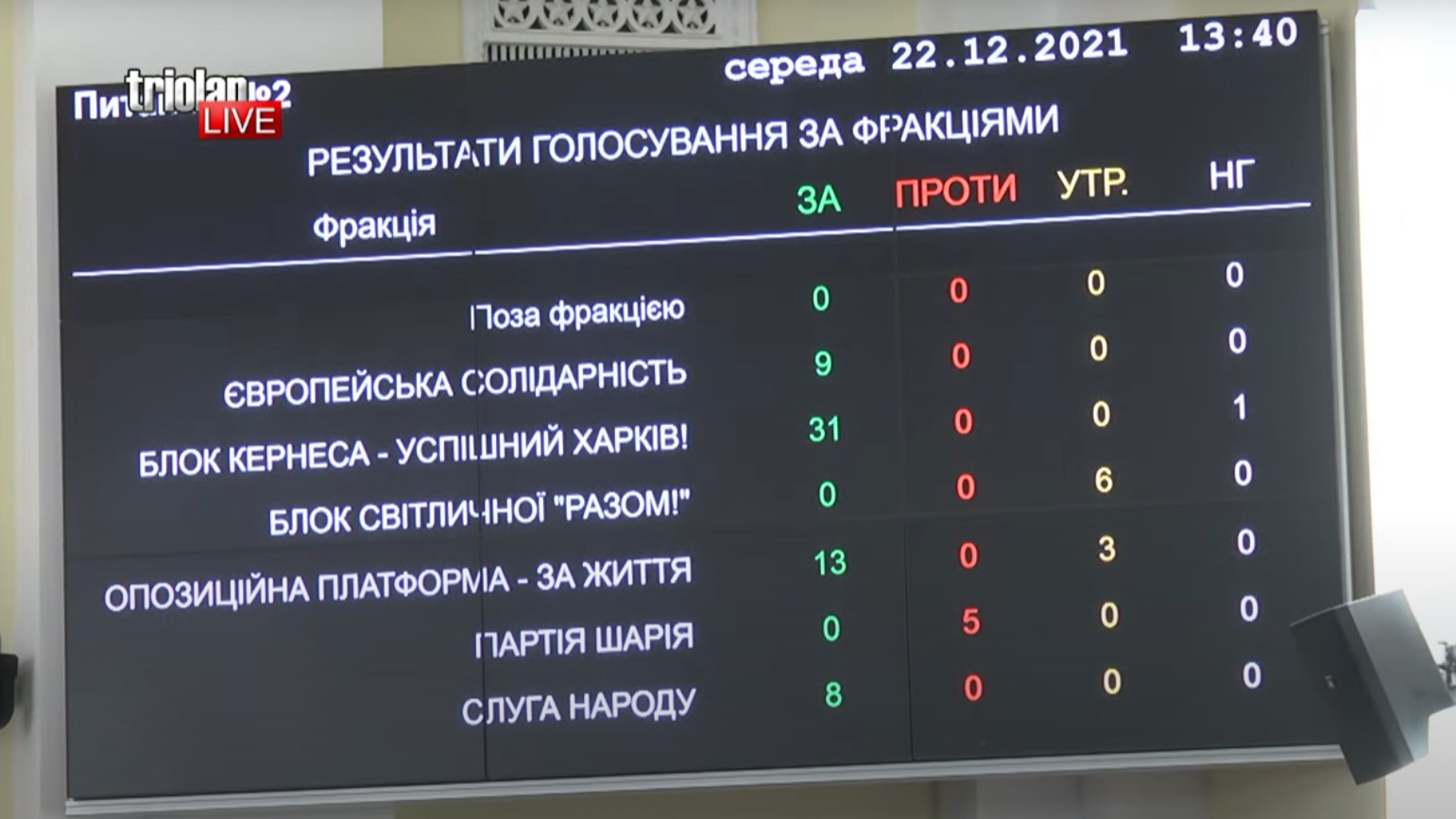 Не голосовали: "Блок Светличной "Вместе!" и внефракционные депутаты. Пять депутатов от "Партии Шария" нажали "красную кнопку".