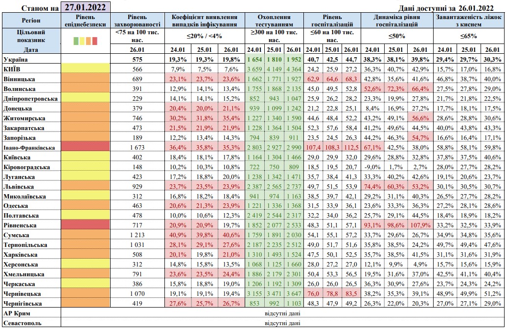 По состоянию на 27 января 2022 года в "красной" зоне карантина находятся уже две области На сегодня в этой зоне — Ивано-Франковская и Ровенская области.