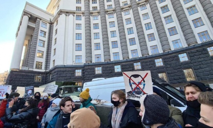 Утром 4 февраля у здания Кабмина студенты Национального университета "Киево-Могилянская академия" требуют отставки министра образования и науки Сергея Шкарлета из-за скандальной ситуации с выборами президента вуза.