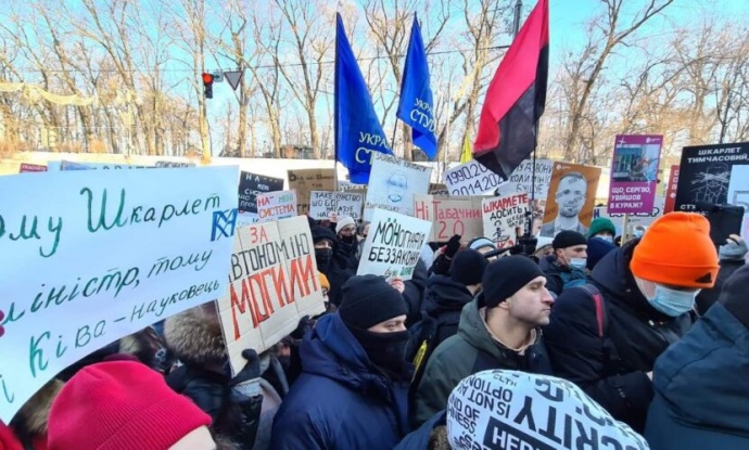 Как сообщает Интерфакс-Украина, в руках у участников акции плакаты с надписями: "#SaveMohylyanka", "Зачем мне система, которая работает против меня", "КМАрафон по отставке Шкарлета", "МОН, вспомни закон", "Образованием не торгуют", "Отмени министра, а не выборы", "Свободу выбора".