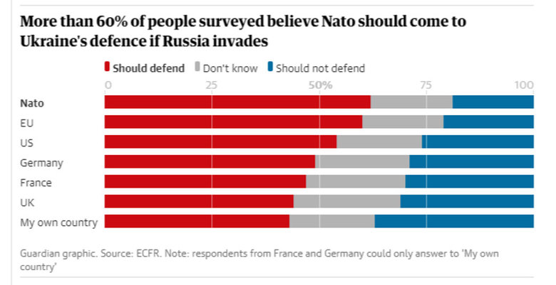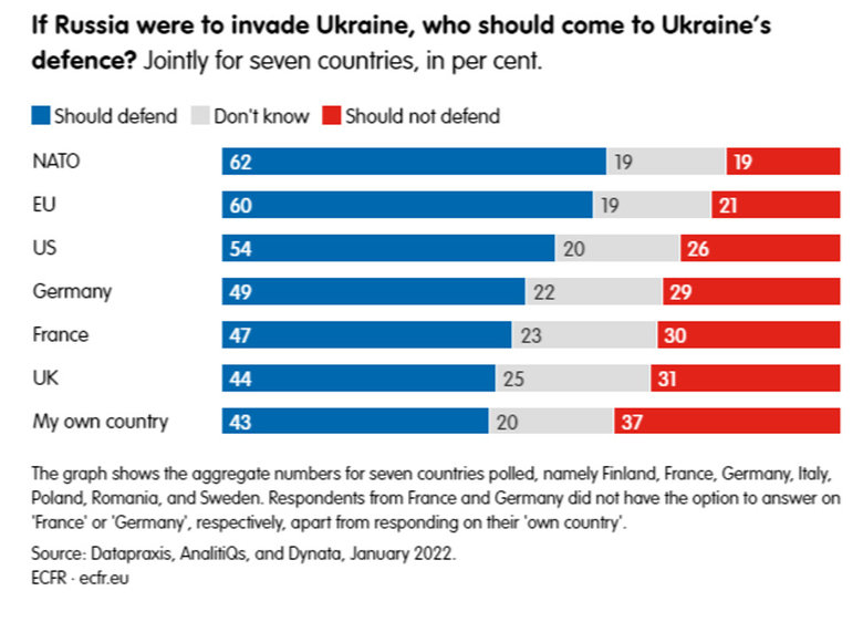 Более половины жителей семи европейских стран считают, что НАТО или ЕС должны стать на защиту Украины в случае вторжения России.