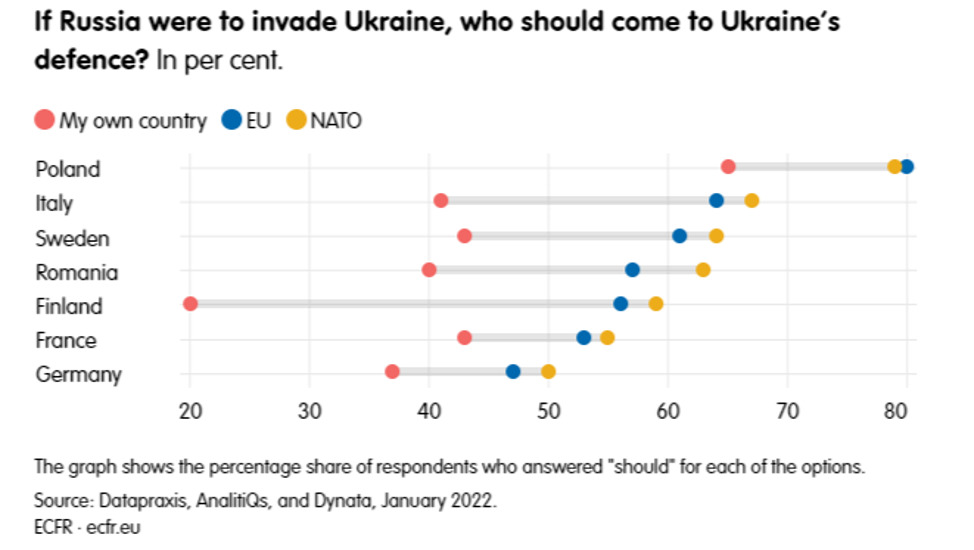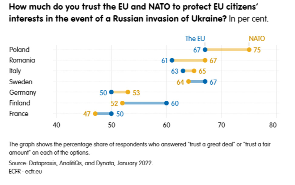 На вопрос, кому больше доверяют в защите интересов граждан ЕС в случае вторжения России в Украину, по меньшей мере половина опрошенных в каждой стране (более 60% в Польше, Швеции, Италии и Румынии) ответили, что доверяют ЕС. В двух странах, Швеции и Финляндии, доверие к ЕС было даже больше, чем к НАТО.