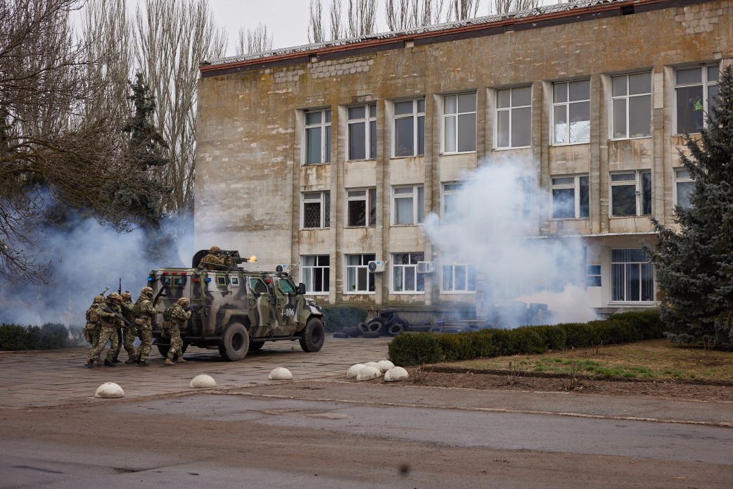 В рамках рабочей поездки в Херсонскую область президент Владимир Зеленский наблюдал за проведением тактико-специальных учений сил и средств, входящих в систему Министерства внутренних дел Украины. Учения проходят в пгт Каланчак на Херсонщине, вблизи административной границы с временно оккупированным Крымом.