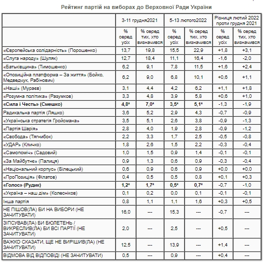За партию "Европейская солидарность" проголосовали бы 22,9% определившихся с выбором опрошенных, за "Слугу народа" – 16,4%, за "Батькивщину" – 11,5%, за "Оппозиционную платформу - За жизнь" – 10,1%, за партию "Наши" Евгения Мураева – 6,2%, за "Разумную политику" Дмитрия Разумкова – 5,8%, за "Силу и честь" Игоря Смешко – 5,1%.