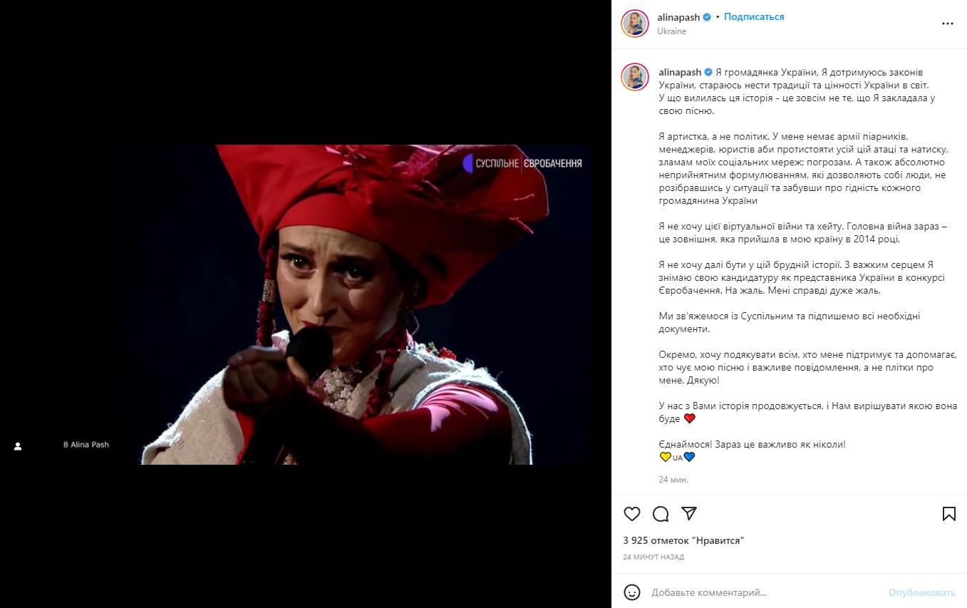 "Я не хочу дальше быть в этой грязной истории. С тяжелым сердцем я снимаю свою кандидатуру как представителя Украины в конкурсе Евровидение. К сожалению. Мне действительно очень жаль", - сказала Паш.