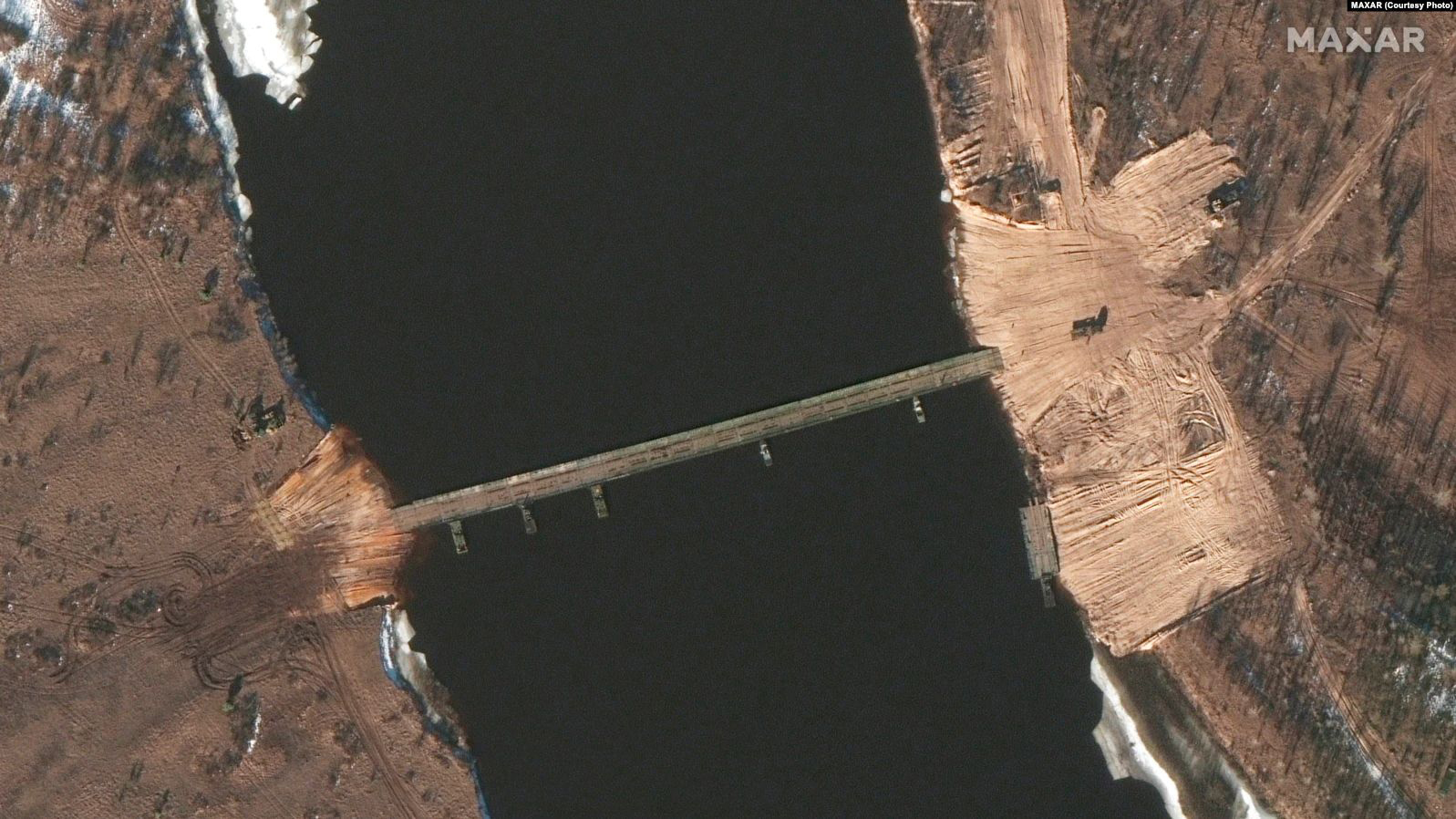 Понтонный мост через реку Припять в Беларуси в шести километрах от украинской границы, о появлении которой сообщили накануне, исчез, сообщает американский телеканал CNN, ссылающийся на спутниковые снимки и источники, знакомые с этим вопросом.