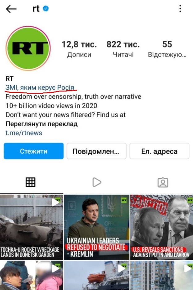 Instagram против российской пропаганды 26 февраля 2022 20:12 Соцсеть Instagram начала маркировать верифицированные аккаунты государственных медиа России. Около них появилась отметка "СМИ, которым управляет Россия". Так выглядят маркированные аккаунты ТАСС и RT: